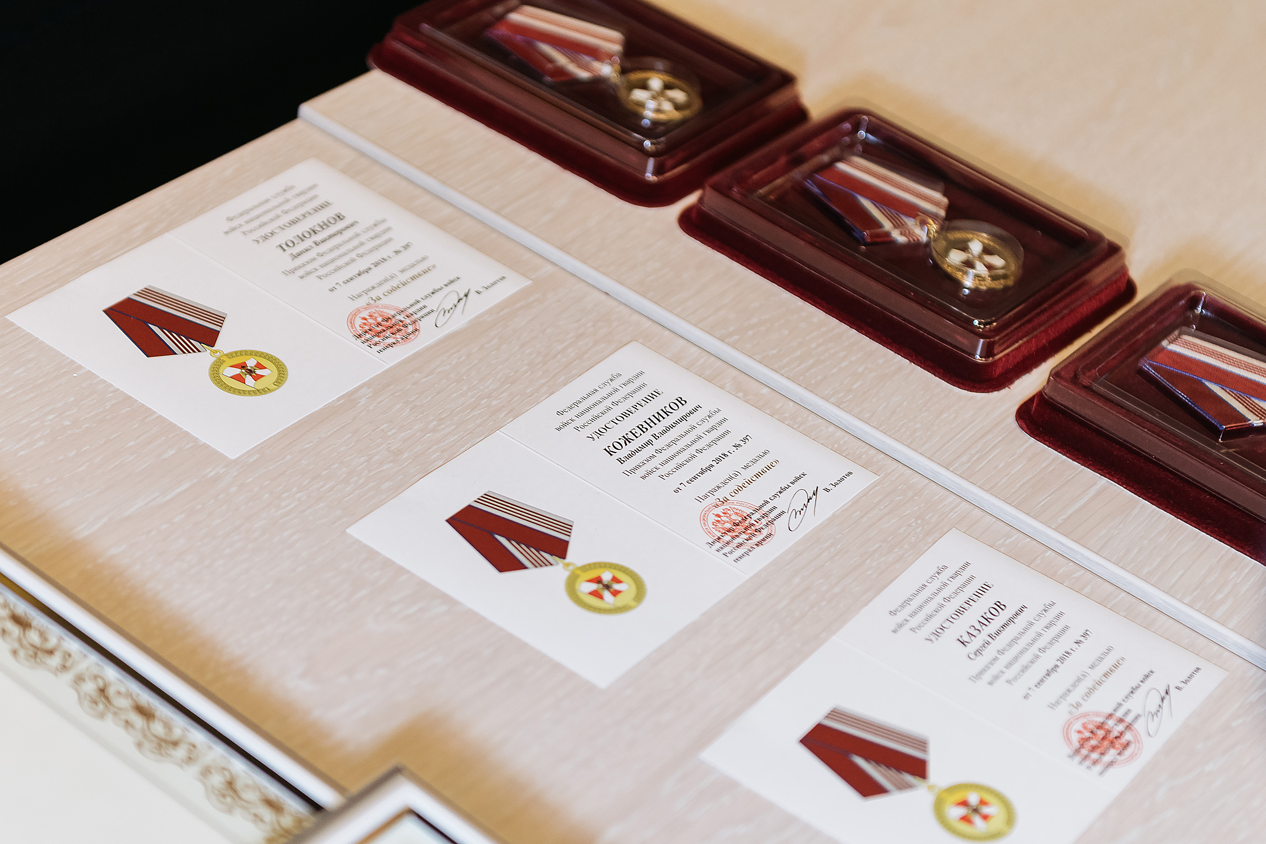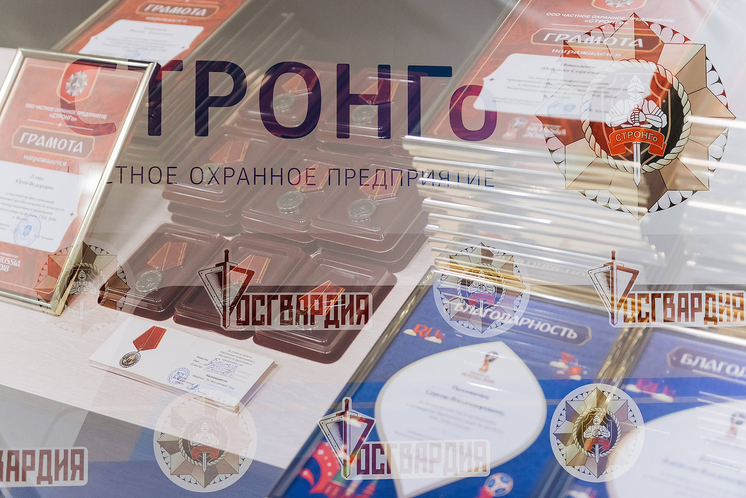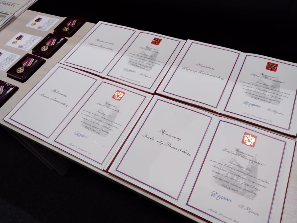 От директора Федеральной службы войск национальной гвардии Российской Федерации генерала армии Виктора Золотова лучшим сотрудникам нашей компании генерал-майор Алексей Зинин вручил медали «За содействие»:Сергею Казакову, Николаю Карнауху, Владимиру Кожевникову, Данилу Толокнову, почетные грамоты: Ивану Архипову, Вадиму Бешнову, Дмитрию Филиппову и благодарности: Фёдору Батракову, Валентину Киливнику, Сергею Шпилевому. «Благодаря слаженной совместной работе правоохранительных органов и сотрудников вашей организации удалось не допустить серьёзных правонарушений и выполнить все поставленные задачи по обеспечению безопасности на объектах Чемпионата мира по футболу FIFA-2018», – отметил он в своем выступлении.