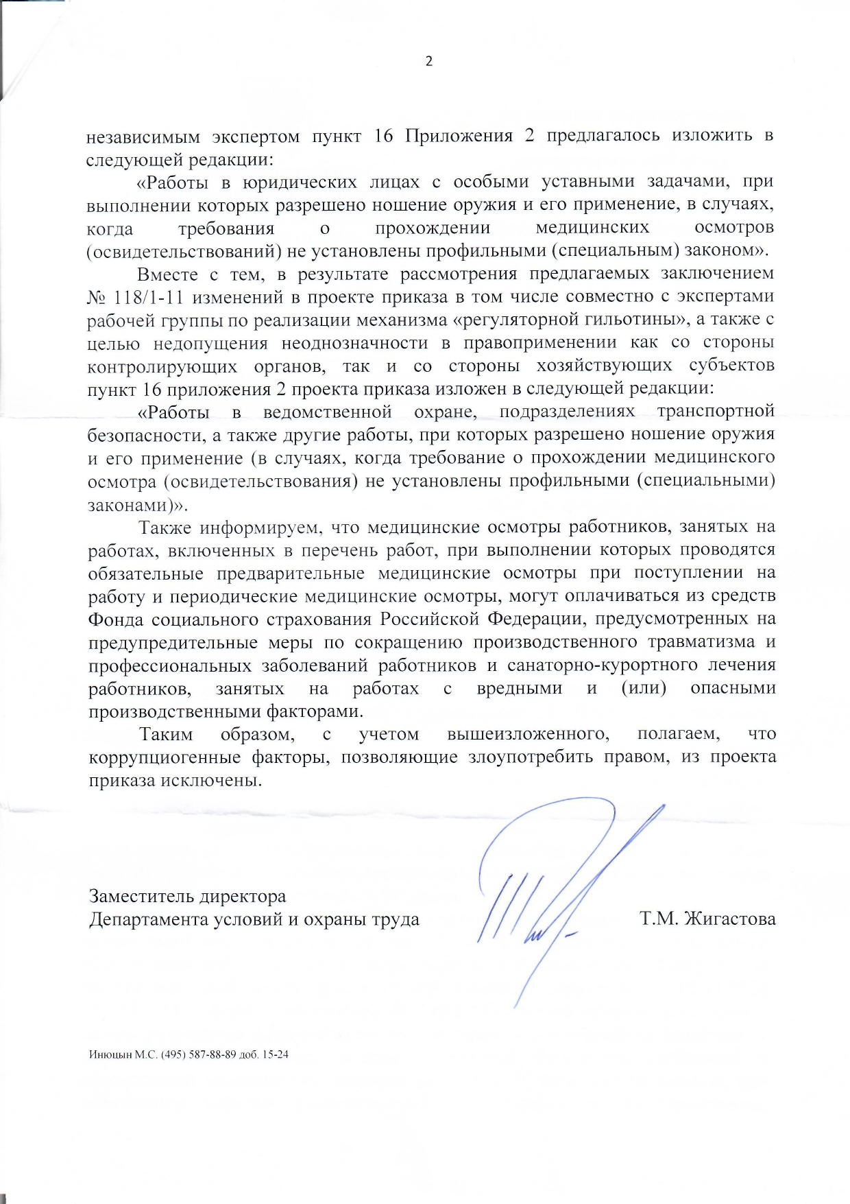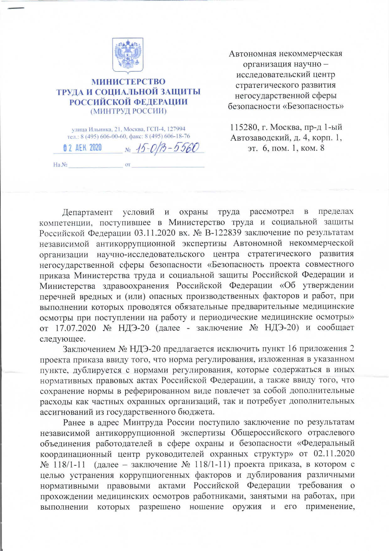 Ранее мы информировали читателей о том, что Минтрудом России совместно с Минздравом России подготовлен проект приказа «Об утверждении перечней вредных и (или) опасных производственных факторов и работ, при выполнении которых проводятся обязательные предварительные медицинские осмотры при поступлении на работу и периодические медицинские осмотры». Во время процедуры общественного обсуждения, которая проходила на федеральном портале проектов нормативных правовых актов, ФКЦ РОС и НИЦ «Безопасность» по результатам независимой антикоррупционной экспертизы подготовили экспертные заключения, а также направили в адрес Минтруда официальные письма с предложениями о внесении изменений в данный законопроект. В распоряжение редакции «ГардИнфо» поступили ответы на эти письма.