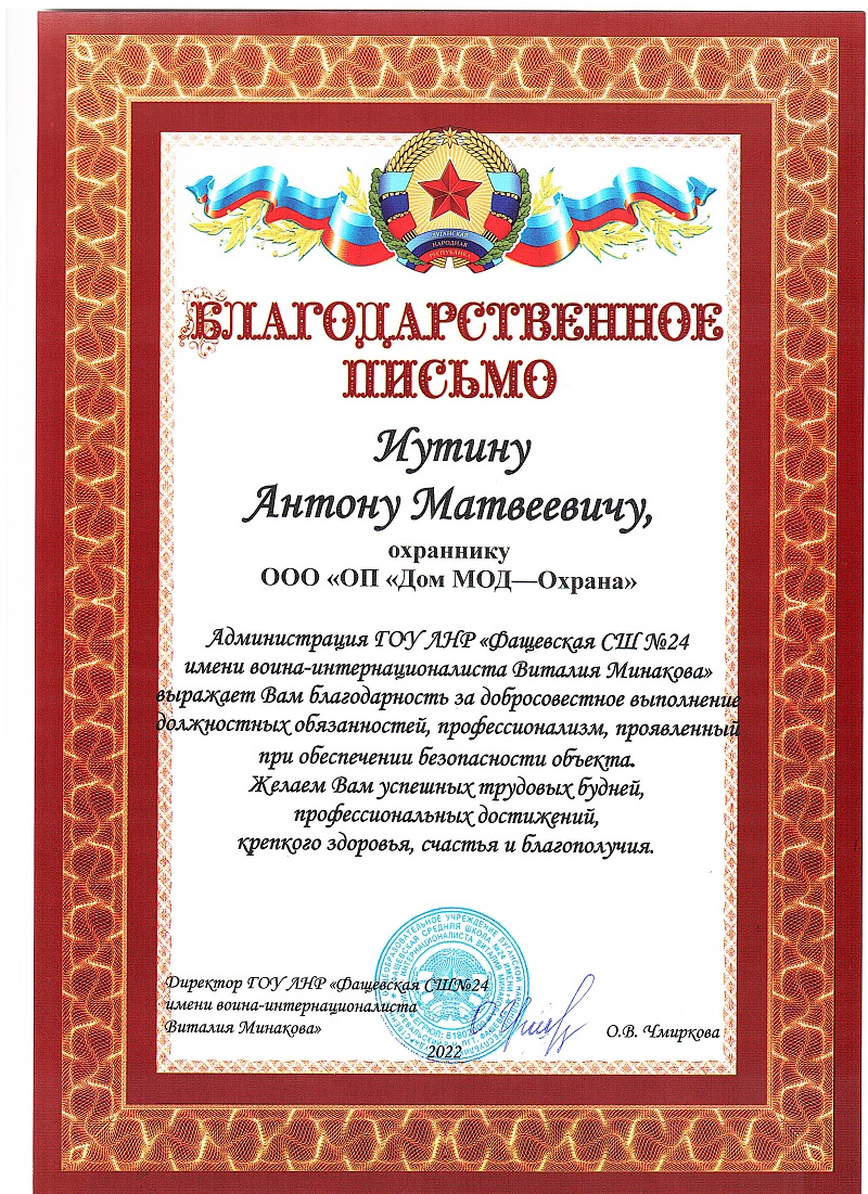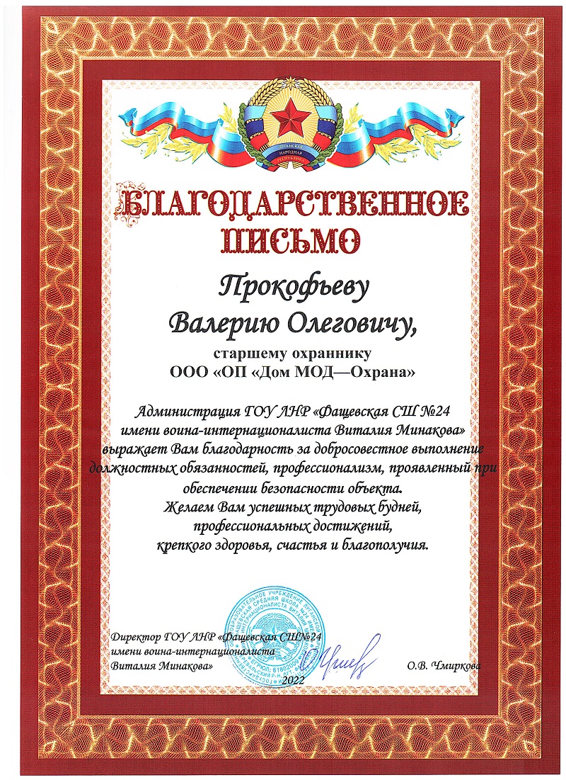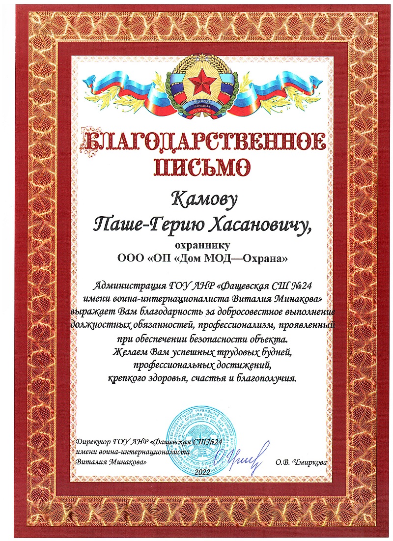 С 1-го сентября, по поручению президента Российской Федерации, в школах на территориях ДНР, ЛНР, Херсонской и Запорожской областей, введена вооруженная охрана. Почетную и ответственную задачу выполняют и сотрудники охранного предприятия «Дом МОД — Охрана» в Луганской народной республике. Сотрудникии: Прокофьев Валерий Олегович, Иутин Антон Матвеевич и Камов Паша-Герий Хасанович, добросовестно исполняющие возложенные на них обязанности по обеспечению безопасности в ГОУ ЛНР «Фащевская СШ № 24 имени воина интернационалиста Виталия Минакова», в ПГТ Фащевка, Перевальского района, ЛНР.