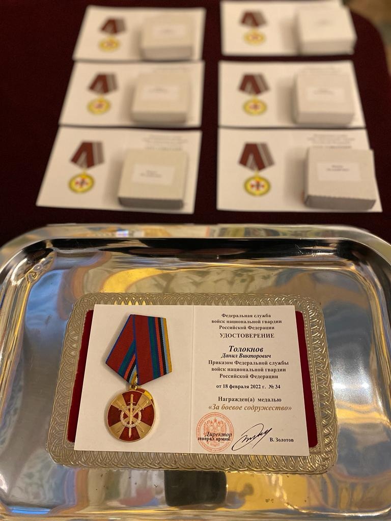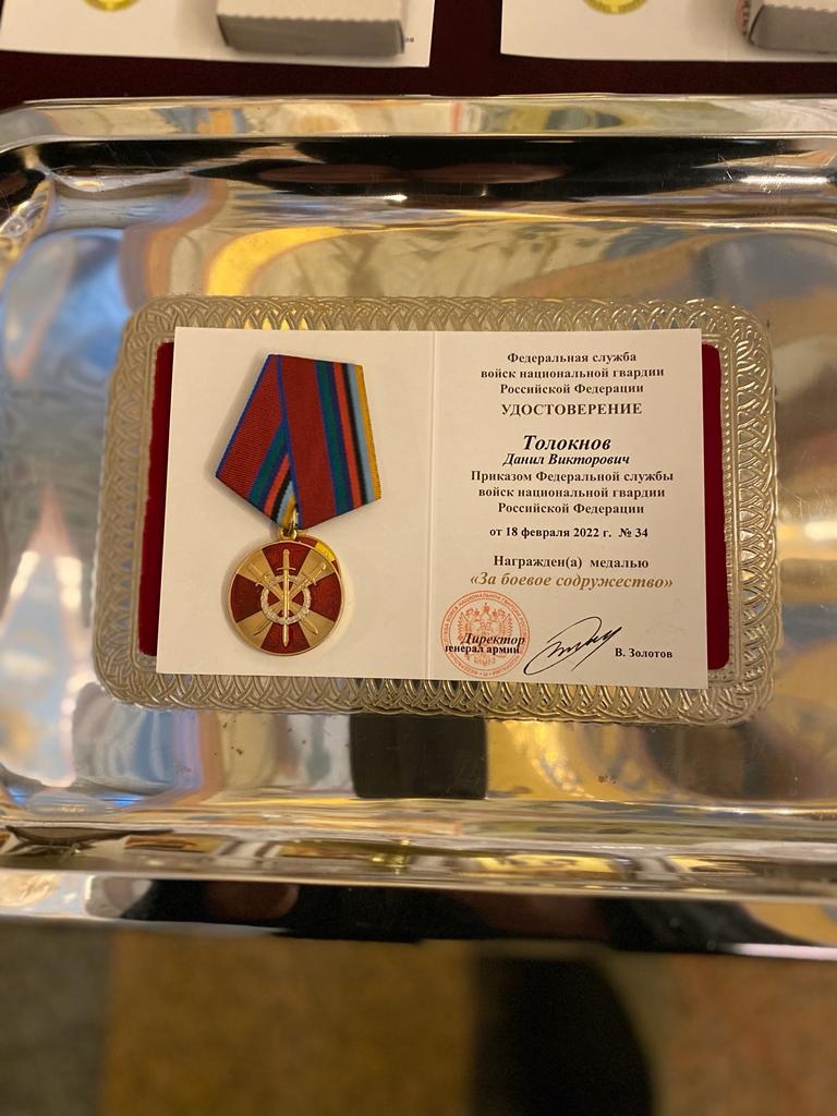 В преддверии Нового года и Рождества Христова Директором федеральной службы войск национальной гвардии Золотовым В.В. был награждён медалью «За боевое содружество» заместитель генерального директора ЧОП «СТРОНГо» Толокнов Данил Викторович.