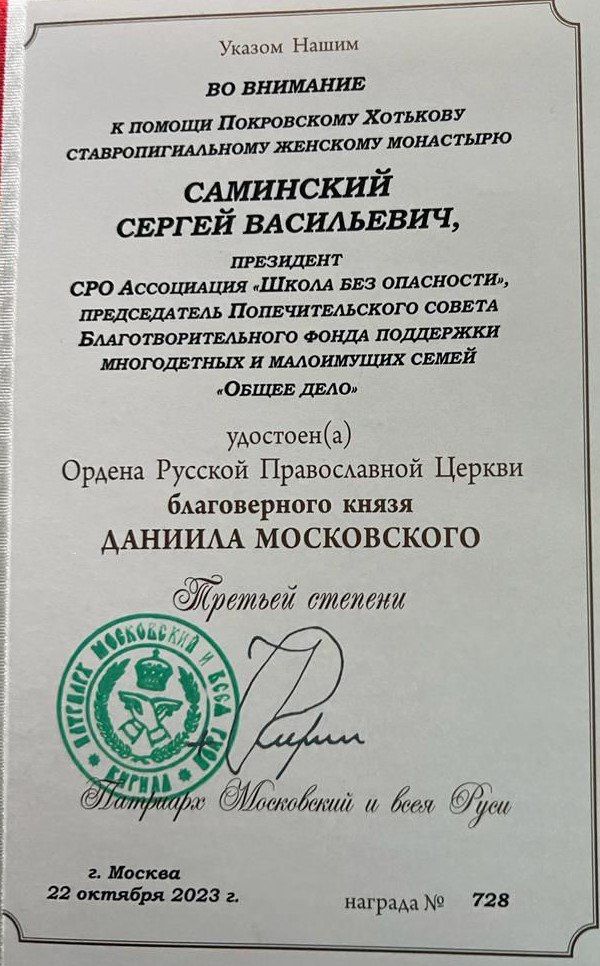 Президенту СРО Ассоциация «Школа без опасности», председателю Попечительского совета Благотворительного фонда поддержки многодетных и малоимущих семей «Общее дело» Сергею Саминскому 22 октября был вручен Орден благоверного князя Даниила Московского III степени. Награду он получил из рук Патриарха Московского и всея Руси Кирилла. Ордена, учрежденного к 1000-летию Крещения Руси, удостаиваются лица, много потрудившиеся для возрождения духовной жизни.