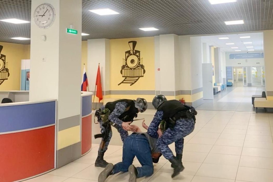 Информацию о том, что в лицей проник посторонний, охранник передает сотрудникам внутреннего поста. В это же время магнитные двери в учреждение блокируются. Уже через несколько минут на место приезжают сотрудники Росгвардии, подразделения МВД и МЧС. Преступника задерживают, а портфель, который он оставил у входа, проверяют спецслужбы на наличие взрывоопасных веществ. Учеников в это время эвакуируют через запасные выходы.
